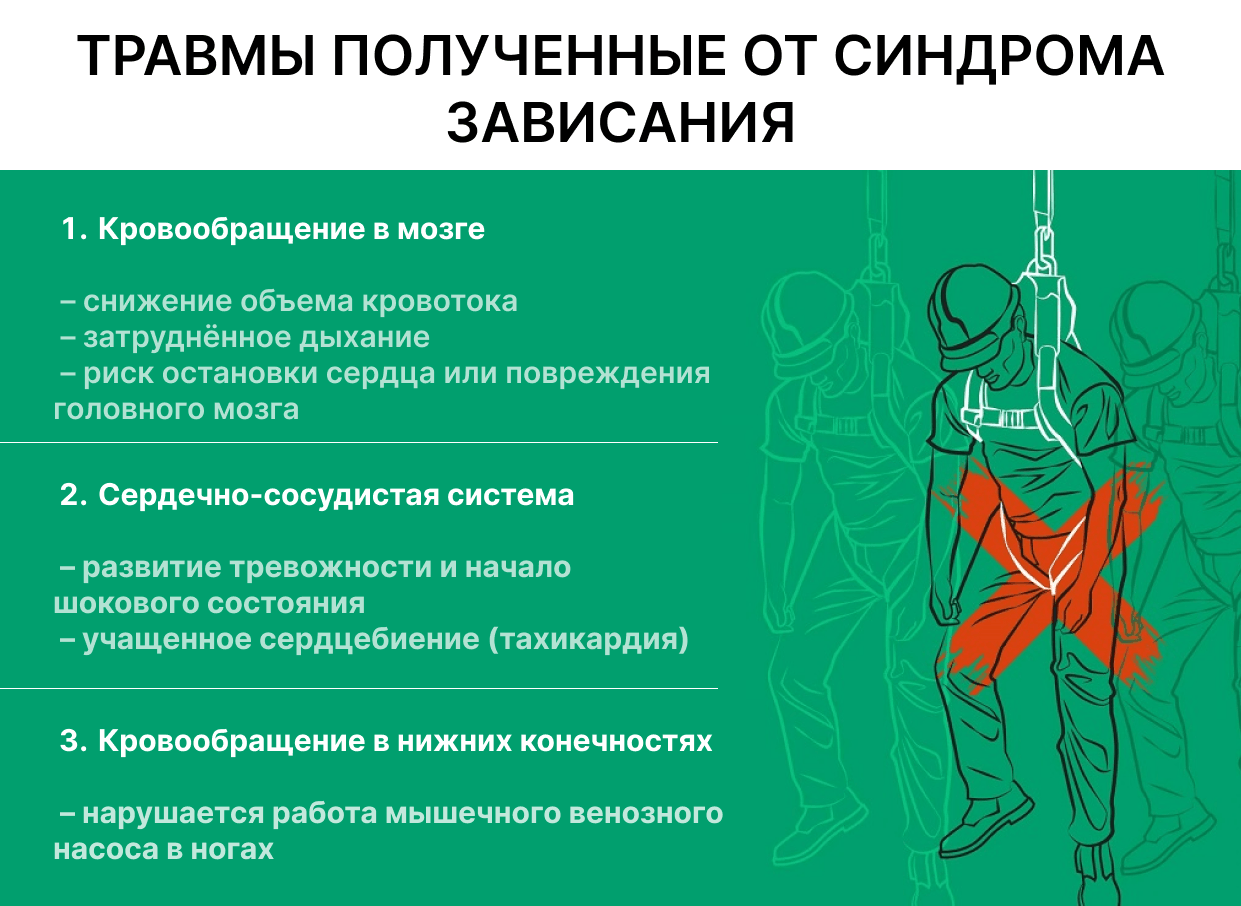После срыва с высоты страховочная система останавливает падение, и человек остаётся висеть в страховочной привязи. На первый взгляд может показаться, что ситуация под контролем, но именно в этот момент возникает серьёзная угроза для жизни.