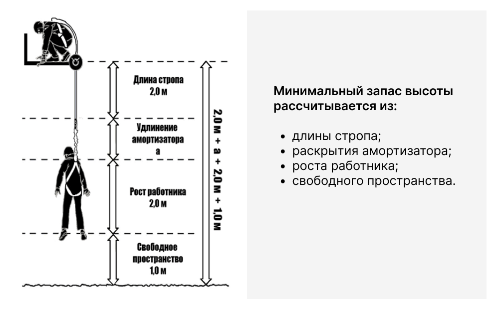 Запас высоты — это минимальное расстояние от точки крепления до возможного нижнего препятствия (пола, оборудования, земли), необходимое для безопасного срабатывания всей системы. Если его недостаточно — работник может удариться о землю даже при наличии страховки.