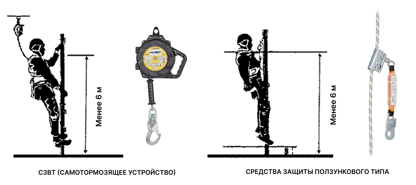 Если вы выбираете между обычным страховочным стропом, СЗВТ или СИЗ ползункового типа мы рекомендуем отдать предпочтение СЗВТ и СИЗ ползункового типа — они обеспечивает более высокую степень безопасности.