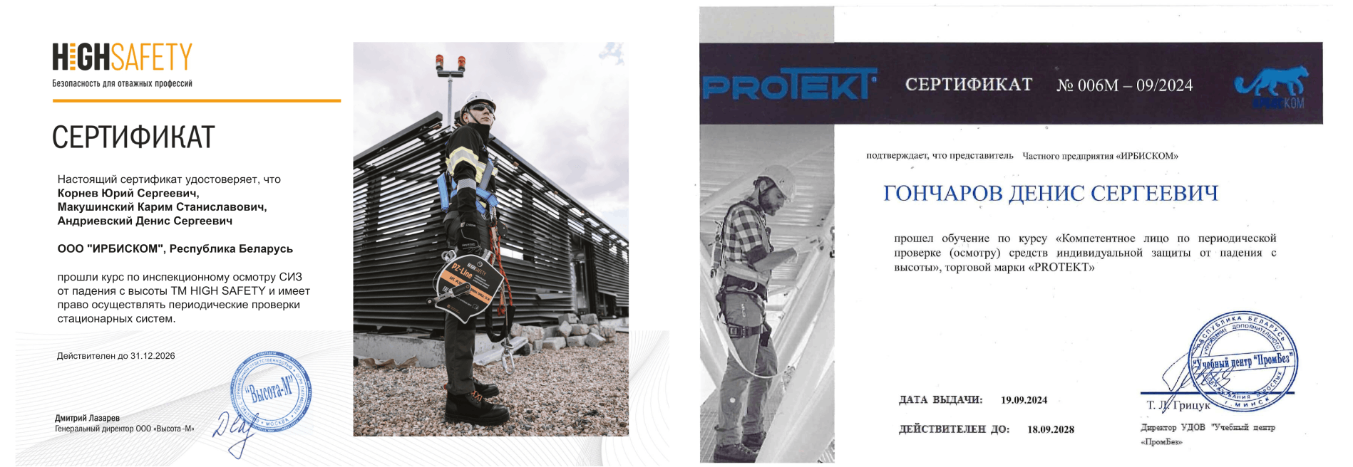 Специалисты компании «ИРБИСКОМ» имеют необходимые сертификаты и допуски для проведения инспекционного контроля СИЗ от падения с высоты.
